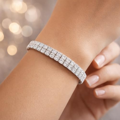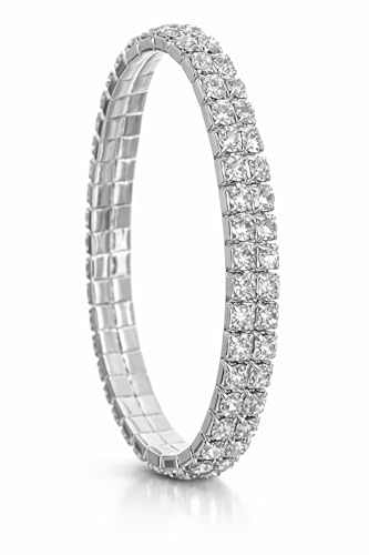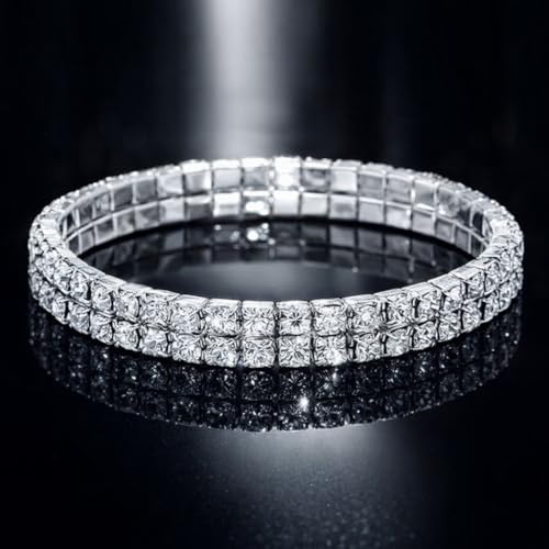 Generic - Double Row Crystal Rhinestone Stretch Bracelet, Silver Tone, Princess Cut Stones, Elastic Band