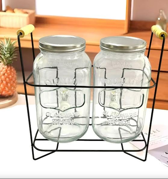 - 【Material】: This product is made of glass, transparent glass that ensures durability and longevity. 【Package Includes】: Each package comes with 2 glass jars, 1 faucet for easy dispensing, and 1 stand for convenient storage. 【Versatile Use】: With a capacity of 4L each, these jars are good for storing and serving various beverage such as juice, milk, cola or cocktails in restaurants or at home. 【Design】: The jars come with an easy-to-use faucet that ensures smooth flow of beverage without any spillage or mess. The stand provides stability and adds to the aesthetic appeal of the setup.