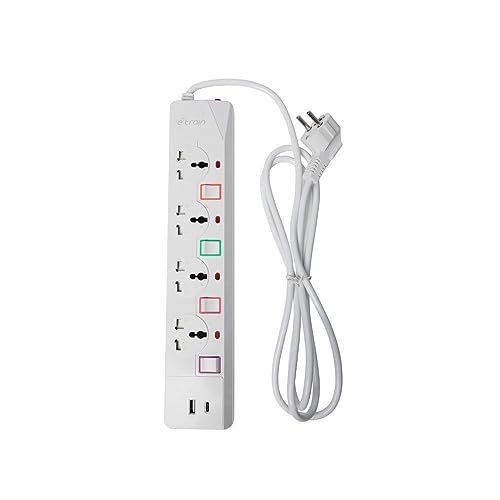 Etrain - مشترك طاقة 16 امبير مع حماية من الحمل الزائد، 4 مقابس خرج + 1 USB + 1 منفذ شحن نوع سي 2.4 امبير 2 متر - مفتاح تشغيل وايقاف (PS077) من اي ترين