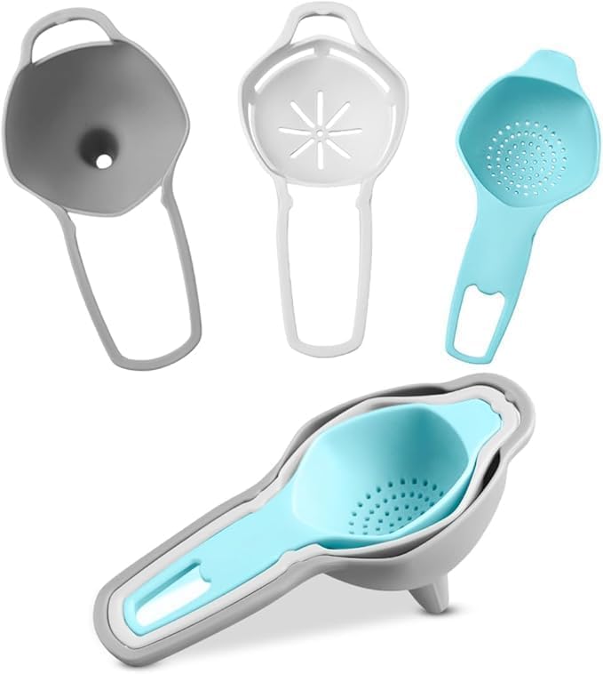 generic - مجموعة فواصل بلاستيكية لصفار البيض مكونة من 3 قطع مع مصفاة وقمع، الوان متنوعة - ادوات مطبخ اساسية لسهولة فصل البيض ومستلزمات الطبخ (ازرق، ابيض، رمادي)