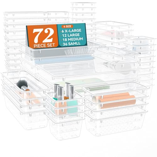 ElegantArray - مجموعة منظم ادراج 72 قطعة من اليجانت اراي، منظم مكياج فانيتي بـ 4 احجام، صناديق تخزين بلاستيكية شفافة للمكياج والقرطاسية وادوات متعددة للمطبخ والحمام والمكتب وغرفة النوم