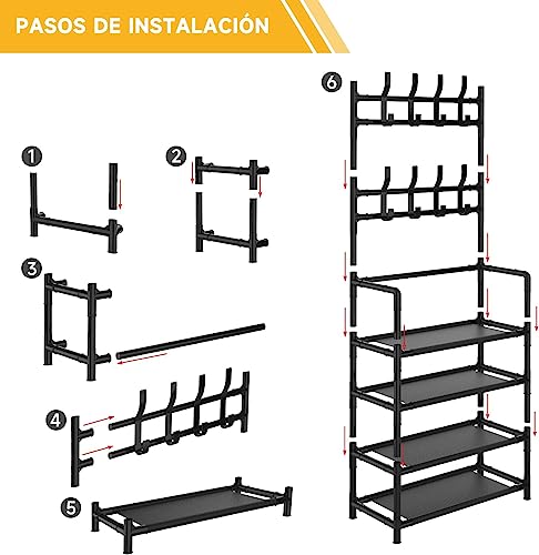 - ✔【Practical Design】2 in 1 design, hat and shoe rack all in one. With 8 removable hooks for various items such as handbags, umbrellas, key chains, scarves, hats, etc. (not recommended for hanging coats), and 4-tier shelves to store 12 pairs of shoes (3 pairs per floor), you can easily find what you need, while putting on shoes, making everything at hand when in a hurry.
