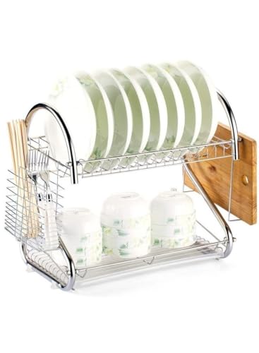 Generic - رف اطباق من الستانلس ستيل بطبقتين مع حامل اواني وزجاج واكواب وحامل ادوات مائدة ومصفاة اطباق لسطح منضدة المطبخ، مجفف اطباق مطلي بالكروم فضي من الترزون
