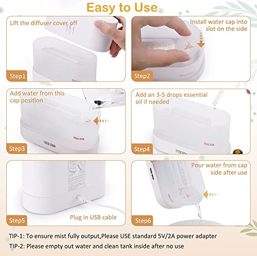 - 【Easy to Use】Press the left button to turn on/off diffuser, press the right button for the 1st time to turn on the yellow light, 2nd press the button to change to 7-color mode, 3rd press the button to keep the color, 4th press the button again to turn off.