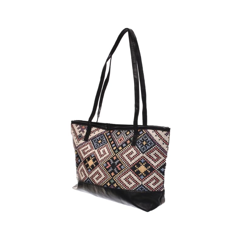 Generic - Fabric Women's Top Faux Leather Handle Bag With Vintage Design For Daily Use - Black