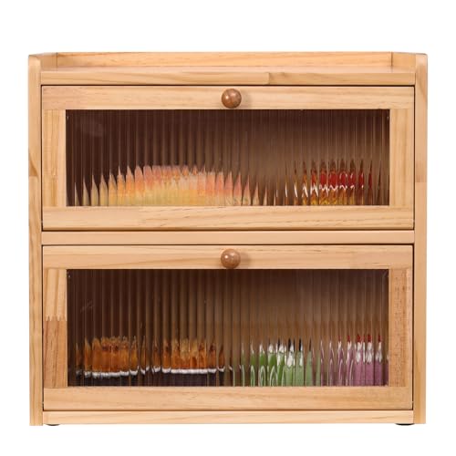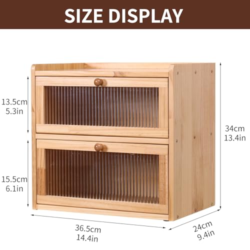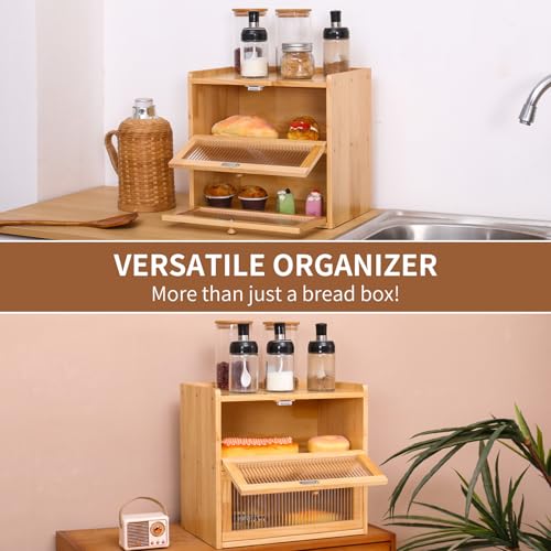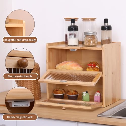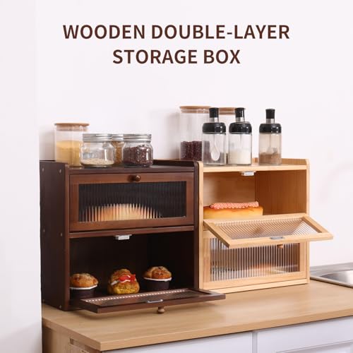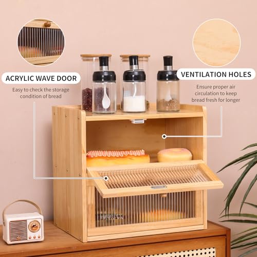 FDHUIJIA - Double Layer Large Bread Box for Kitchen Counter, Wooden Bread Storage Container with Acrylic Window, (natural)