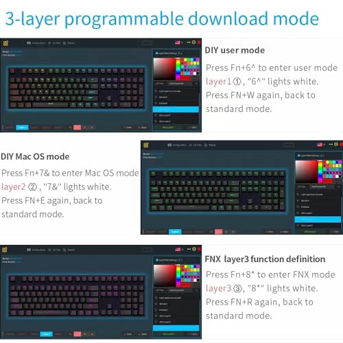 - 【Three Layers Fully Programmable】Custom is not just a word. We make it true. Here you have 3 layers of user editing modes, redefining your personalized keyboards according to your preference and scenarios. Simply download the driver and you will be able to program the backlight and macro settings. Built-in flash memory can save the setting at offline mode, never afraid of losing it, Record macros through the software, customize advanced features, personalize function keys