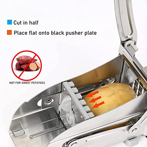 - EASY TO USE : Effortlessly prep your fries and vegetables. Our heavy-duty pulldown lever firmly presses your potato through the sharp stainless steel blades. Built with sturdy legs and suction cup base for optimal leverage while cutting. Simply place our French fries cutter on any flat smooth surface and lock in the suction cup to prevent slippage. Locking systems ensure the blades don't move while cutting for a consistent cut.