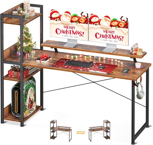 FurniFlex - Computer Desk with Storage Shelves and Monitor Stand, 55-Inch Size, Rustic Brown