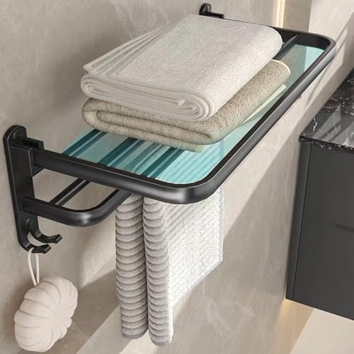 Fvemiatzy - No Drilling Towel Rack Foldable Towel Shelf Towel Bar Towel Holder for Bathroom Wall, Matte Black Towel Holder Bathroom Accessories, Bathroom Towel Rack Wall Mounted Stainless Steel 24 Inch