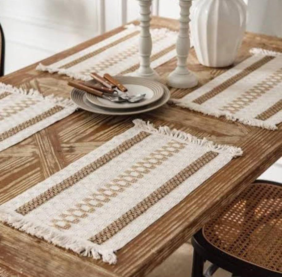 - تصميم بوهيمي: مفارش أنيقة منسوجة تتميز بنمط مخطط كريمي وبني مع تفاصيل شراشيب مزخرفة تضيف لمسة بوهيمية أنيقة إلى طاولة الطعام أو ديكور المطبخ