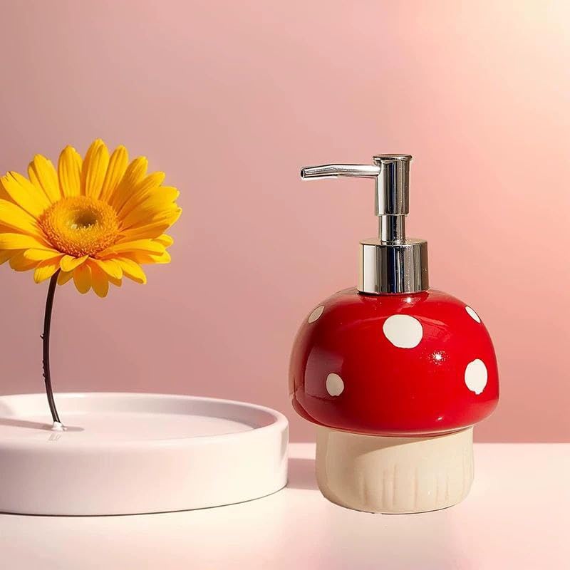 - CHARMING DESIGN: Mushroom-shaped soap dispenser features a vibrant red cap with white polka dots and cream-coloured base, adding a whimsical touch to your bathroom or kitchen décor