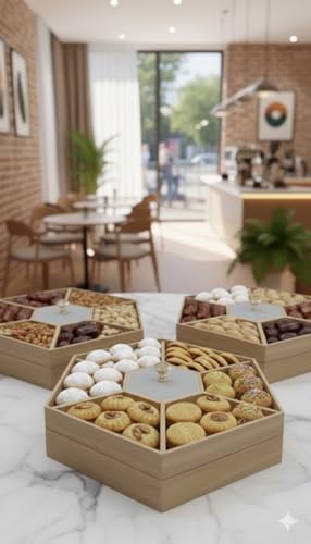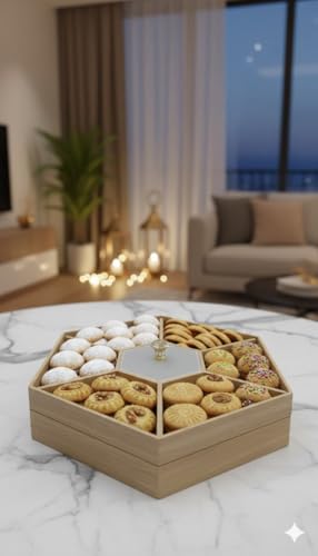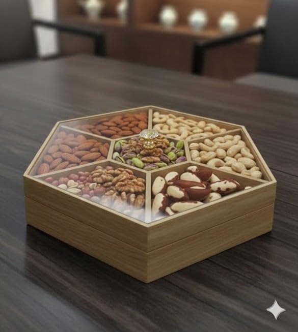 • ELEGANT DESIGN: Hexagonal wooden serving dish with 7 separate compartments for organised presentation of nuts, sweets, cookies, petit fours, and candy