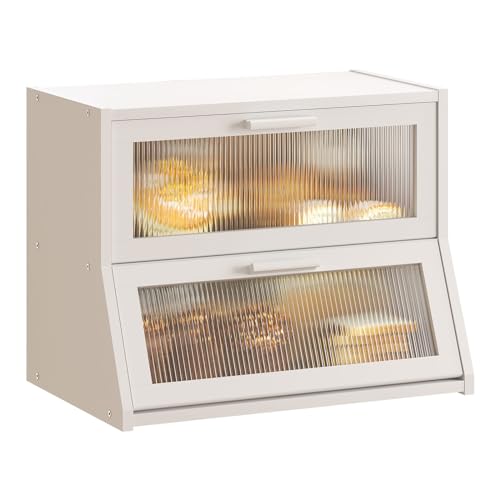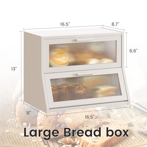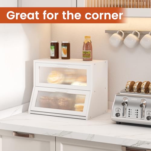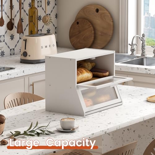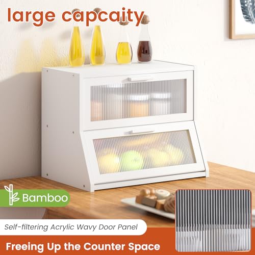 GHWIE - GHWIE Double Layer Bamboo Bread Box for Kitchen Counter,Large Capacity Bread Storage Bin,Bread Container with Acrylic Wavy Door Panel,White