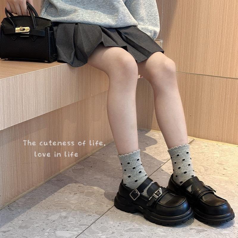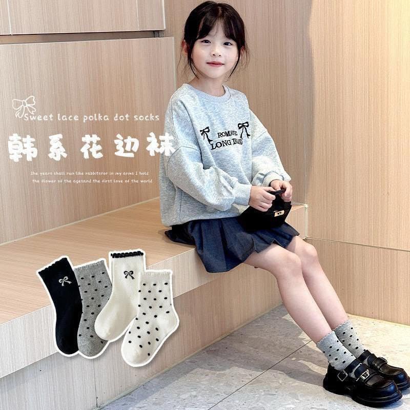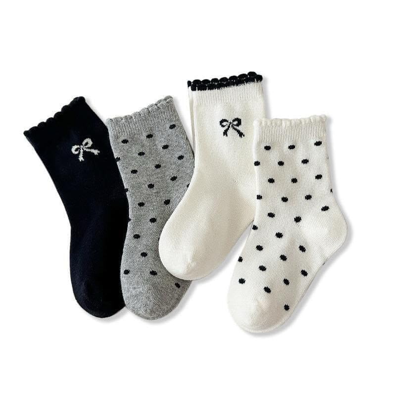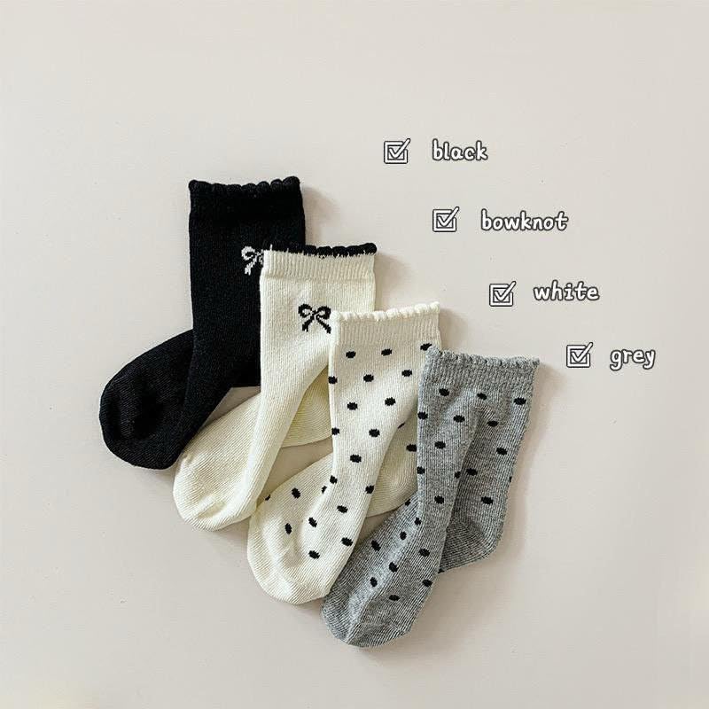 GLAMIA - Girls Socks 6 Pack, Polka Dot and Bow Design, Ruffle Trim, Black Grey White Beige-100