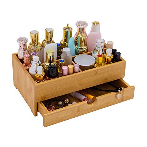 GOBAM - جوبام صندوق تخزين منظم للمكياج ومستحضرات التجميل مع درج يناسب المجوهرات واحمر الشفاه وفرش المكياج والعطور والمزيد خيزران
