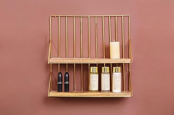 Generic - Gold Wall Shelf with Double Wooden Shelves Organizer for Makeup Perfume Accessories Practical and Elegant Decor for Homes, Offices, Bedrooms, Bathrooms