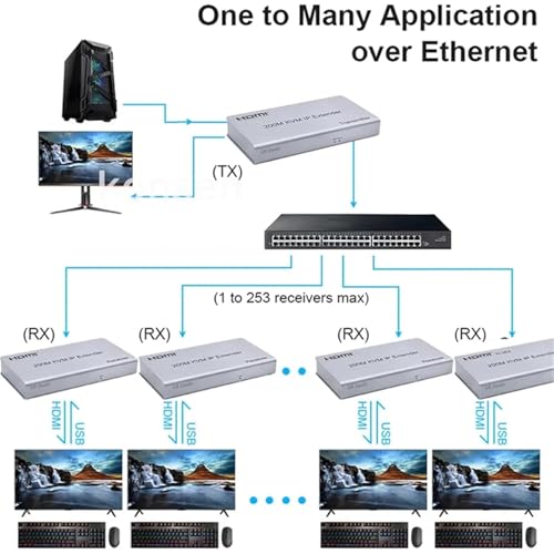 - يعتمد جهاز تمديد كيه في ام (KVM) بمنافذ HDMI عبر بروتوكول الإنترنت على معيار بروتوكول التحكم بالإرسال / بروتوكول الإنترنت. ينقل الإرسال بحد أقصى 120 مترًا من مصدر HDMI أو DVI-D إلى شاشة عالية الدقة HD بواسطة كابل CAT5e/6 واحد. وفي الوقت نفسه، من المريح أيضًا نقل مصدر الصوت والفيديو HDMI عن طريق وضع من نقطة إلى نقطة، ووضع من نقطة إلى عدة نقاط، ووضع الاتصال المتتالي.