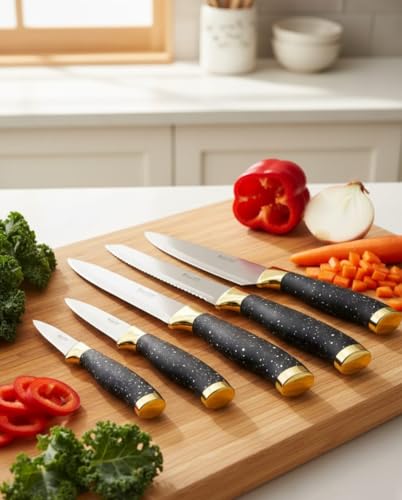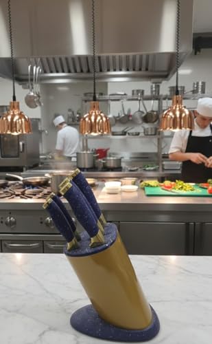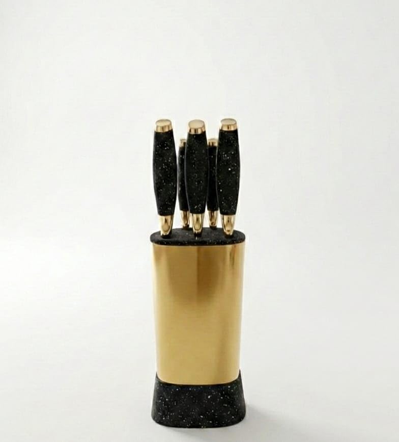 - Set Contents: 5 Set of Different Size Kitchen Knives + Fashion Gold and Black Storage Stand for Kitchen Organizer