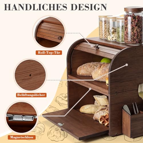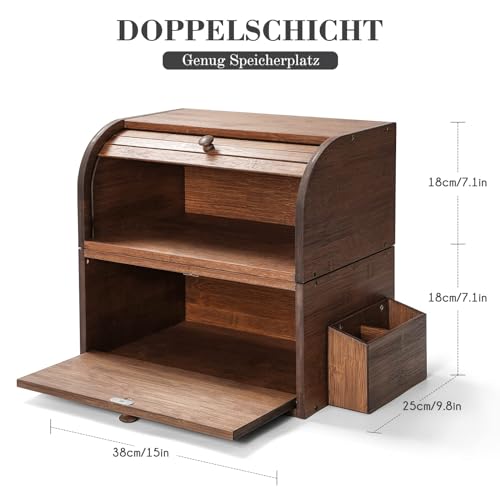 GUUSII HOME - صندوق خبز مصنوع من خشب الخيزران من جوسي هوم، صندوق خبز كبير صديق للبيئة بغطاء ملفوف مزدوج الطبقات قابل للتكديس 38 × 25 × 36 سم، صناديق خبز طبيعية غير لامعة للحفاظ على الخبز الطازج واللذيذ