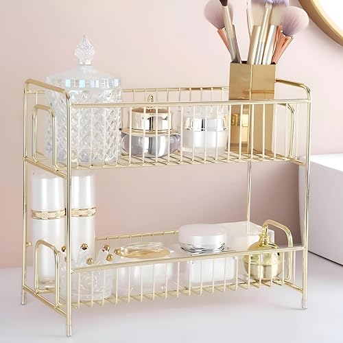 - Multi-tiered organizer with elegant metal frame designed to expand surface area and accommodate makeup, perfumes, and skincare products, measuring 30 × 26.5 cm