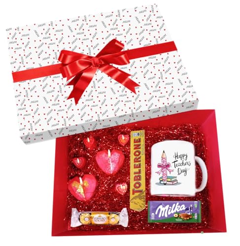 - COMPLETE GIFT HAMPER: Thoughtfully curated Teachers Day gift set includes a ceramic mug with 'Happy Teachers Day' design, premium chocolates including Toblerone, Ferrero Rocher, and Milka, plus decorative heart-shaped candles