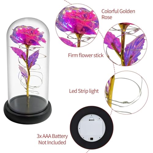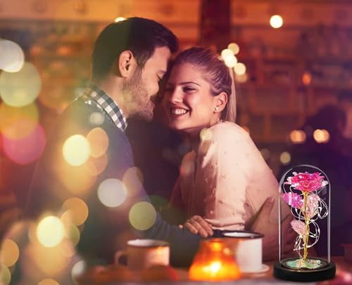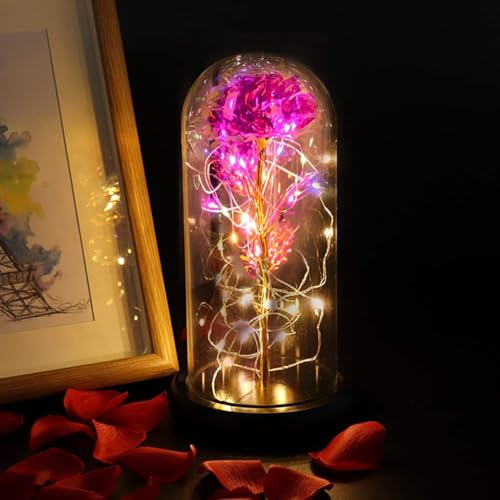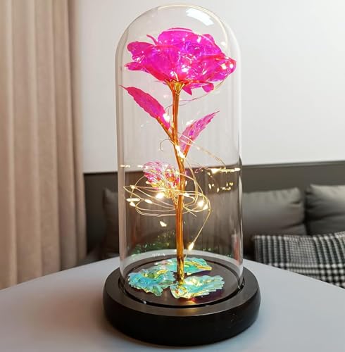 HaRvic - وردة في الزجاج، وردة خالدة في الزجاج مع ضوء ليد، وردة الجمال والوحش، وردة زهور صناعية، هدايا رومانسية للصديقة وعيد الحب وعيد الميلاد والزفاف والديكور من هارفيك (وردي بينك)