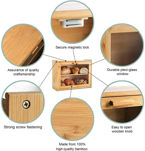 - [Friendly Material]--The bread box is made of thick and durable bamboo wood which is without chemical, waterproof, easy to clean up. A durable bamboo material is virtually unbreakable. 100% bamboo can make food more natural and safety.