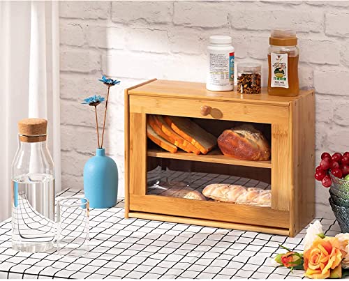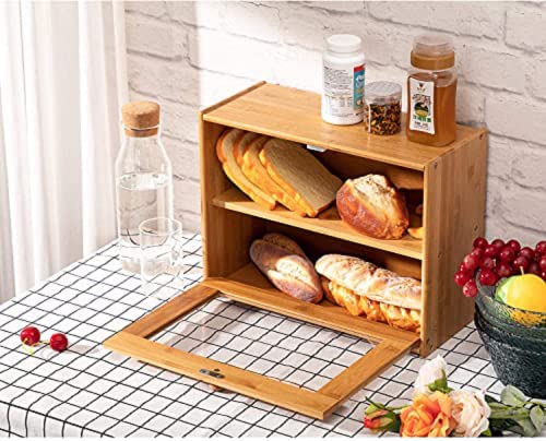 - [Perfect Design]--Double layer bread box allows you to store more food, its tall and multi-level design gives your larger storage, release kitchen space. Magnetic safety lock makes bread bin more stable, operate more smoothly and easily, also protect pet away.