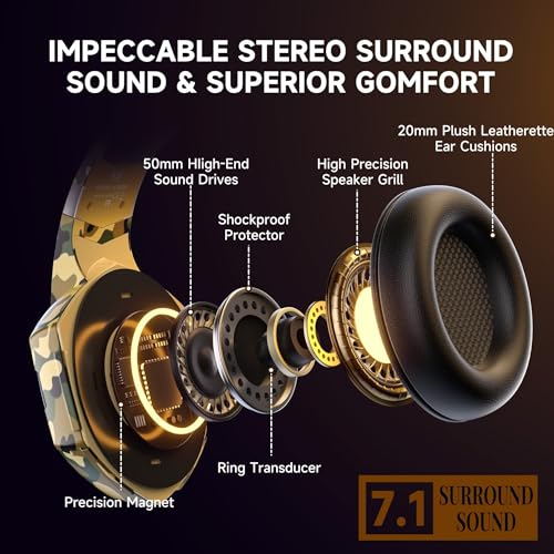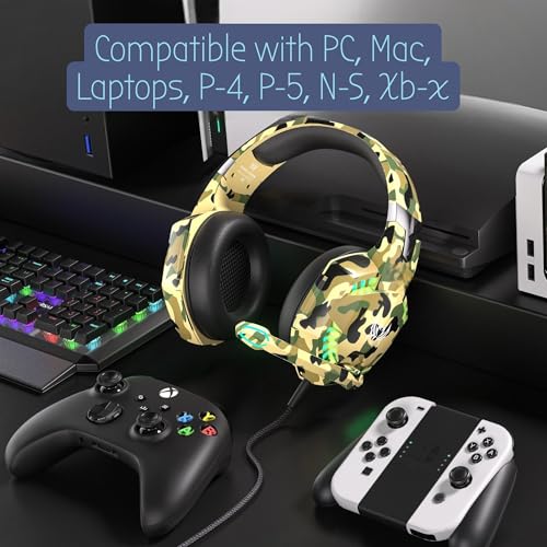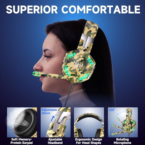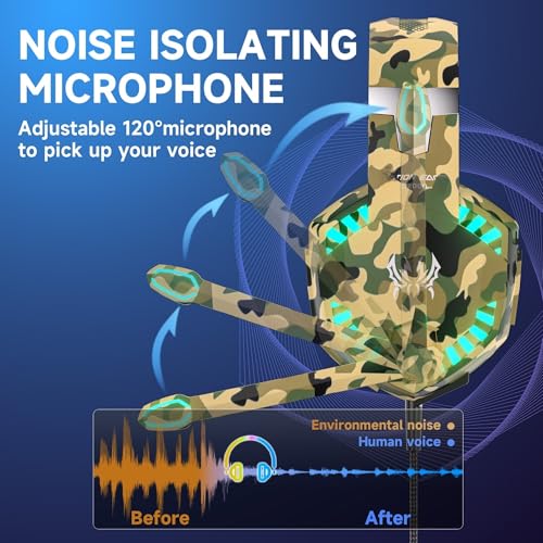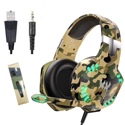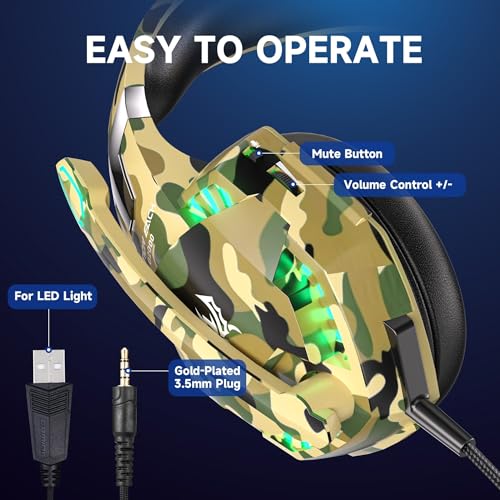 Generic - Headphone G2000 with Military Camouflage Design, LED Lighting and Noise-Canceling Microphone, Wired Headphones (3.5mm) with Volume Control, Compatible with PC, Mac, Laptops, P-4, P-5, N-S, Xb-x