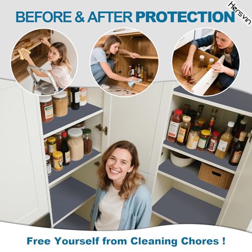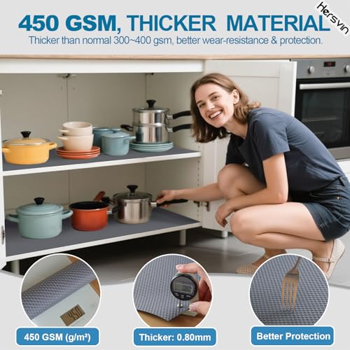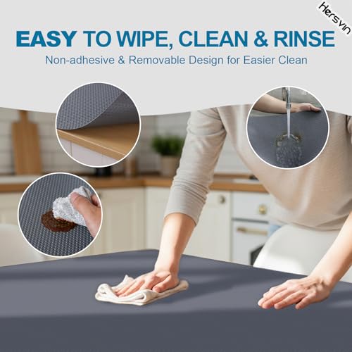 - NON SLIP & NON ADHESIVE --- Hersvin protective EVA shelf pad has convex polka dots textured design on top (ventilated, non-slip and non-stick when putting things on) and smooth pattern (avoid rucking up). Non-adhesive surface ensures no sticky residue left on shelf after changing it out.