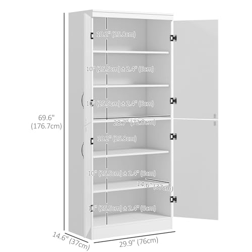 - Ample Storage Space: Come with six-tier shelving, this kitchen pantry storage cabinet with doors provides spacious room for holding cookbooks, dry goods, tableware and other daily supplies. 4 doors keep your items safe and clean, while the elegant metal handles for easy accessing.