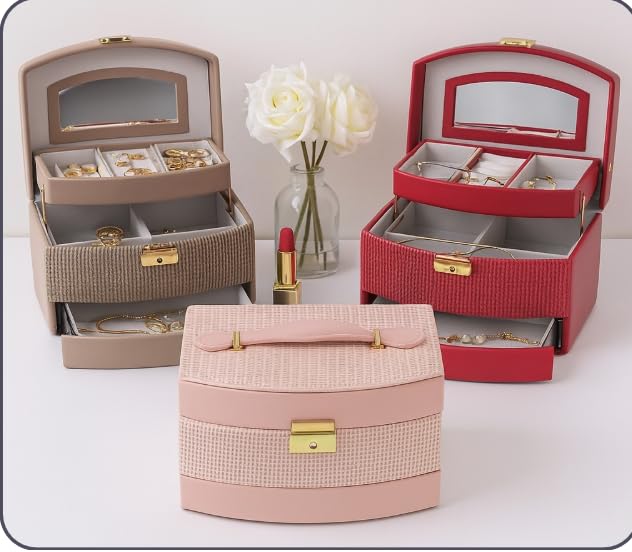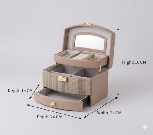 - High-End Elegant Design: Featuring a sophisticated textured exterior with a premium PU leather finish, this jewelry box is a stunning addition to any vanity. Its classic aesthetic is elevated by gold-tone hardware and a sleek top carry handle.