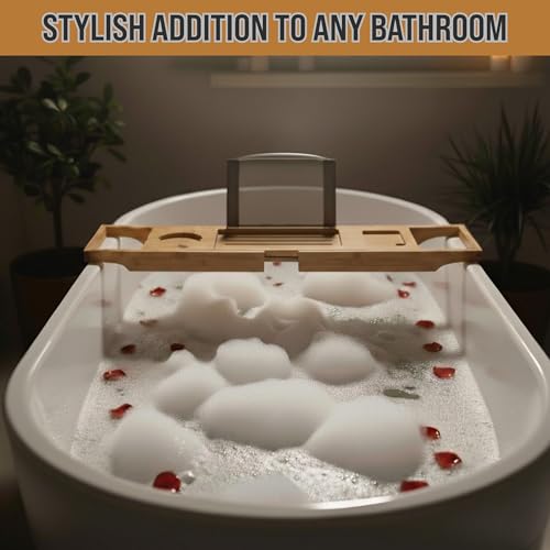 - تصميم عملي - حافظ على المشروبات قريبة منك على ديكور الحمام الأنيق والعملي. فتحة للأكواب ذات الساق تضمن بقاء كوب النبيذ أو الشمبانيا في مكانه أثناء النقع الفاخر، بينما توفر المساحة على الجانب مساحة لكوب ساخن بالبخار.
