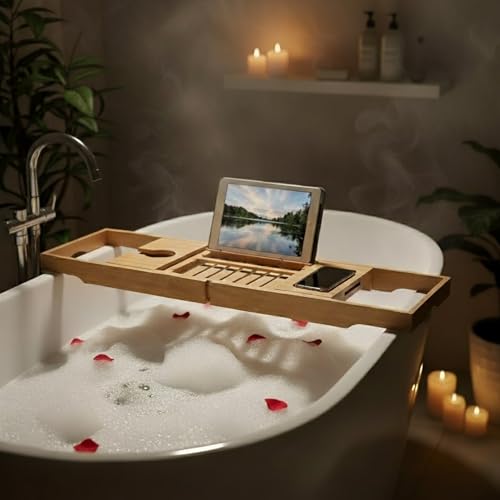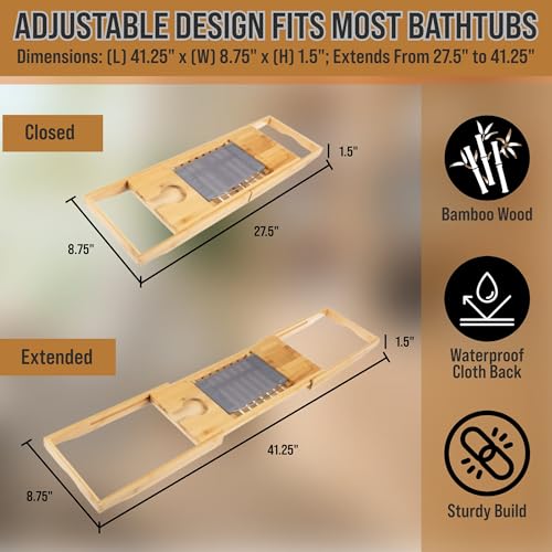 - مقاس مناسب - قم بتمديد جوانب منظم الحمام هذا بسهولة للحصول على مقاس مناسب لحوض الاستحمام الخاص بك. ما عليك سوى تحريك الجوانب للخارج حتى تستقر على حواف حوض الاستحمام الخاص بك للحصول على إعداد سريع وفعال يبقى ثابتًا خلال الحمامات الطويلة.