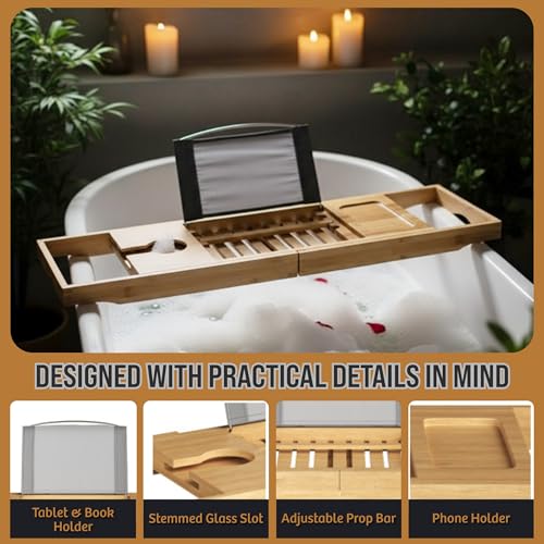 - هدية رائعة - قم بإهداء منظم الحمام هذا للأصدقاء أو أفراد الأسرة أو زملاء العمل الذين يستمتعون بالاسترخاء في حوض الاستحمام. تساعد المواد عالية الجودة والتصميم القابل للتعديل والتصميم الانتقالي سهل المطابقة على ملاءمة صينية الحمام هذه بشكل جيد في معظم الإعدادات.