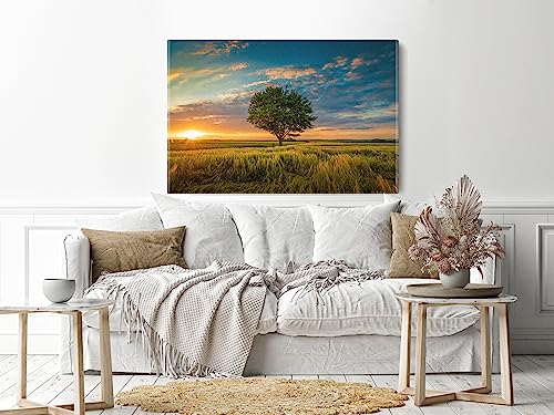 Home Gallery - لوحة فنية جدارية قماش مطبوعة بزاوية عريضة لشجرة واحدة تنمو في سماء غائمة أثناء غروب الشمس محاطة بالعشب مقاس 60×40 سم من هوم جاليري، أزرق