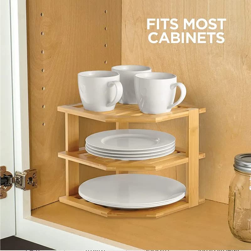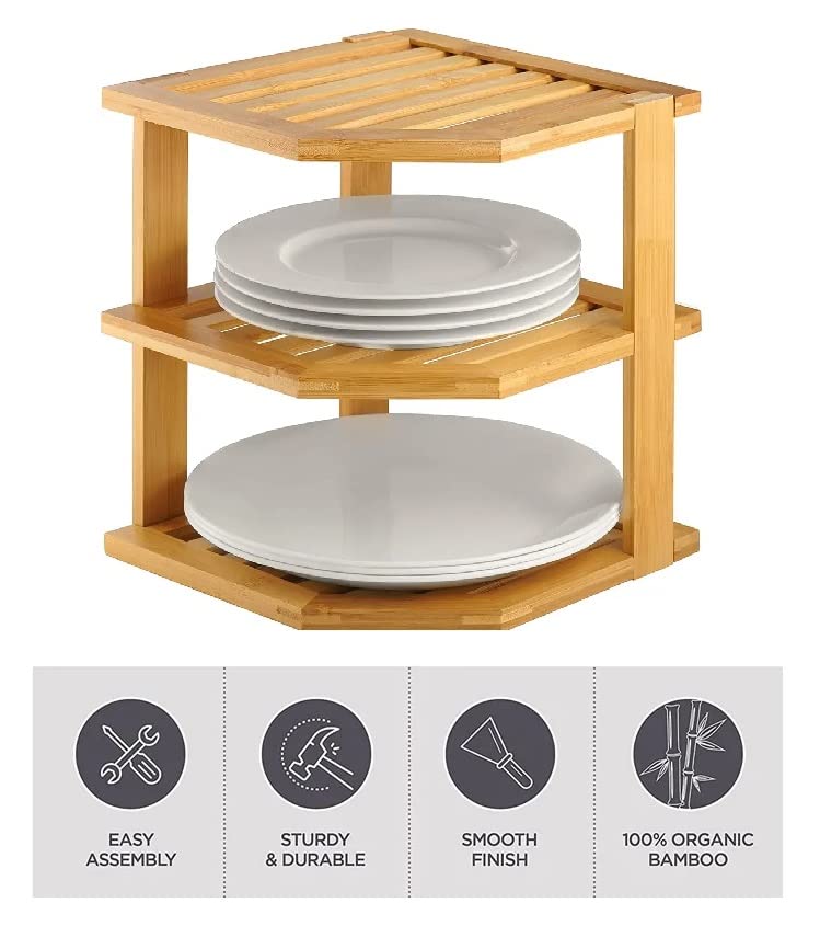 - SMART DESIGN: Boost your kitchen cupboard storage quickly and easily with this three tier natural corner plate rack. It maximises the vertical space in any cupboard, worktop or under sink area.