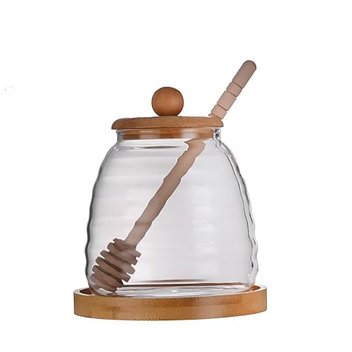 generic - منظم العسل - حاوية زجاجية جذابة مع مغرفة خشبية وغطاء محكم الاغلاق للحفاظ على العسل الطبيعي لفترة طويلة، سعة 500 مل، جاهزة للمطبخ