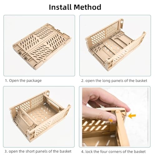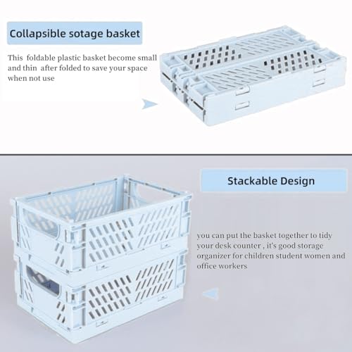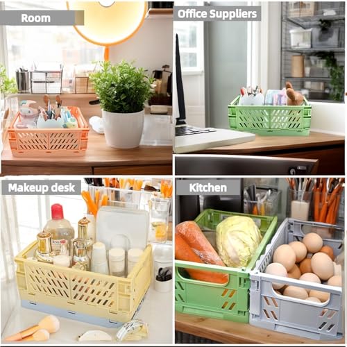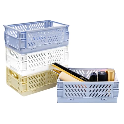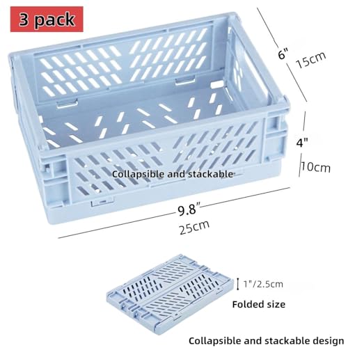 - 【Pastel Crates Size】3pcs pastel plastic bins, 3 different colors: pink, green, cream and light blue;Expanded size: 9.8*6*4 inch, folding size: 9.8*6*1 inch. Tip:Medium-Size Basket is suitable for organizing cosmetics and A5 notebook, please read the product size carefully before purchase!