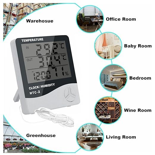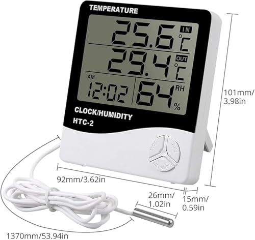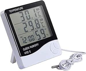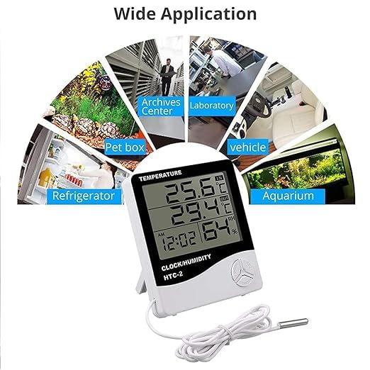 - نطاق قياس واسع: من -50°C إلى +70°C للحرارة ومن 10% إلى 99% للرطوبة ساعة ومنبه مدمج: وظائف متعددة في جهاز واحد لتوفير المساحة والمال