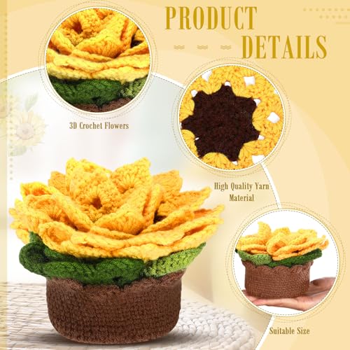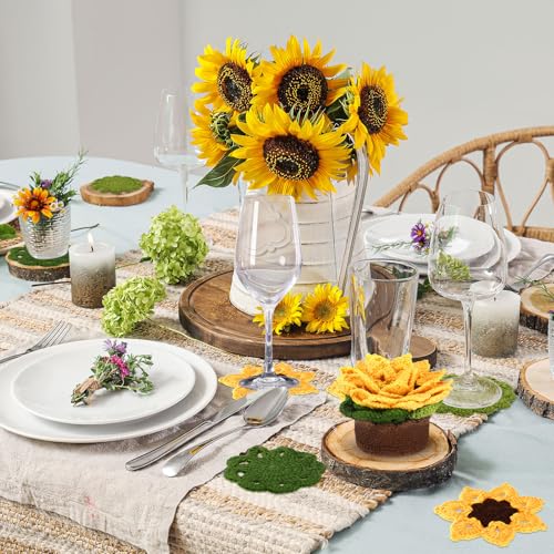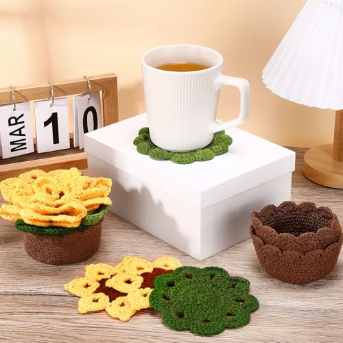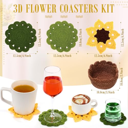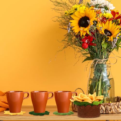 HunnmingRe - 15 قطعة من قواعد اكواب طاولة كروشيه لطيفة ثلاثية الابعاد من هانمينغري، مجموعة قواعد اكواب كروشيه يدوية الصنع مع حامل وعاء نباتات، حصيرة اكواب مزخرفة ناعمة، هدية الانتقال لمنزل جديد (اصفر، عباد الشمس)