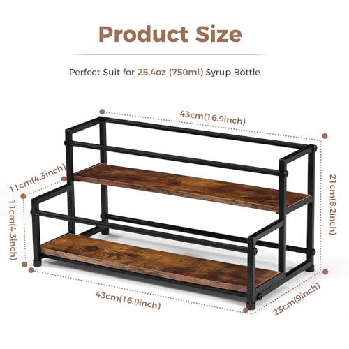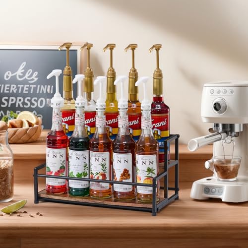 - COFFEE SYRUP ORGANIZER: 2-tier syrup bottle rack keeps syrup of all flavors neatly organized in one place. It can hold up to 10 bottles (750ml) of your favorite syrup bottles, and its tiered design makes it easy to keep an eye on everything on the shelf. Plus, it's perfect for keeping your tabletop tidy