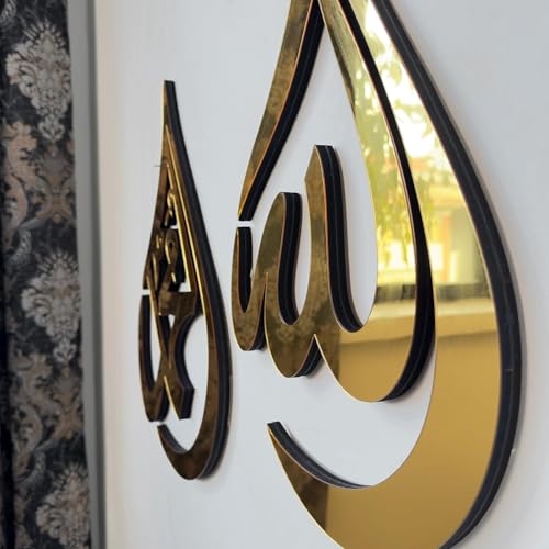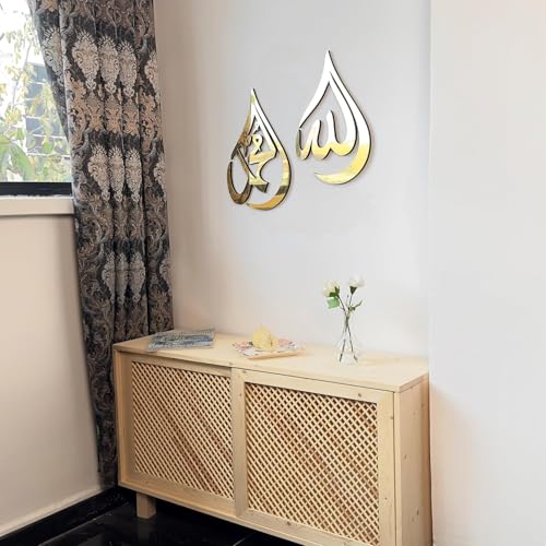 - ELEGANT DESIGN: Teardrop-shaped Islamic calligraphy wall art featuring 'Allah' and 'Muhammad' in elegant Arabic script, crafted from premium gold-finished mdf