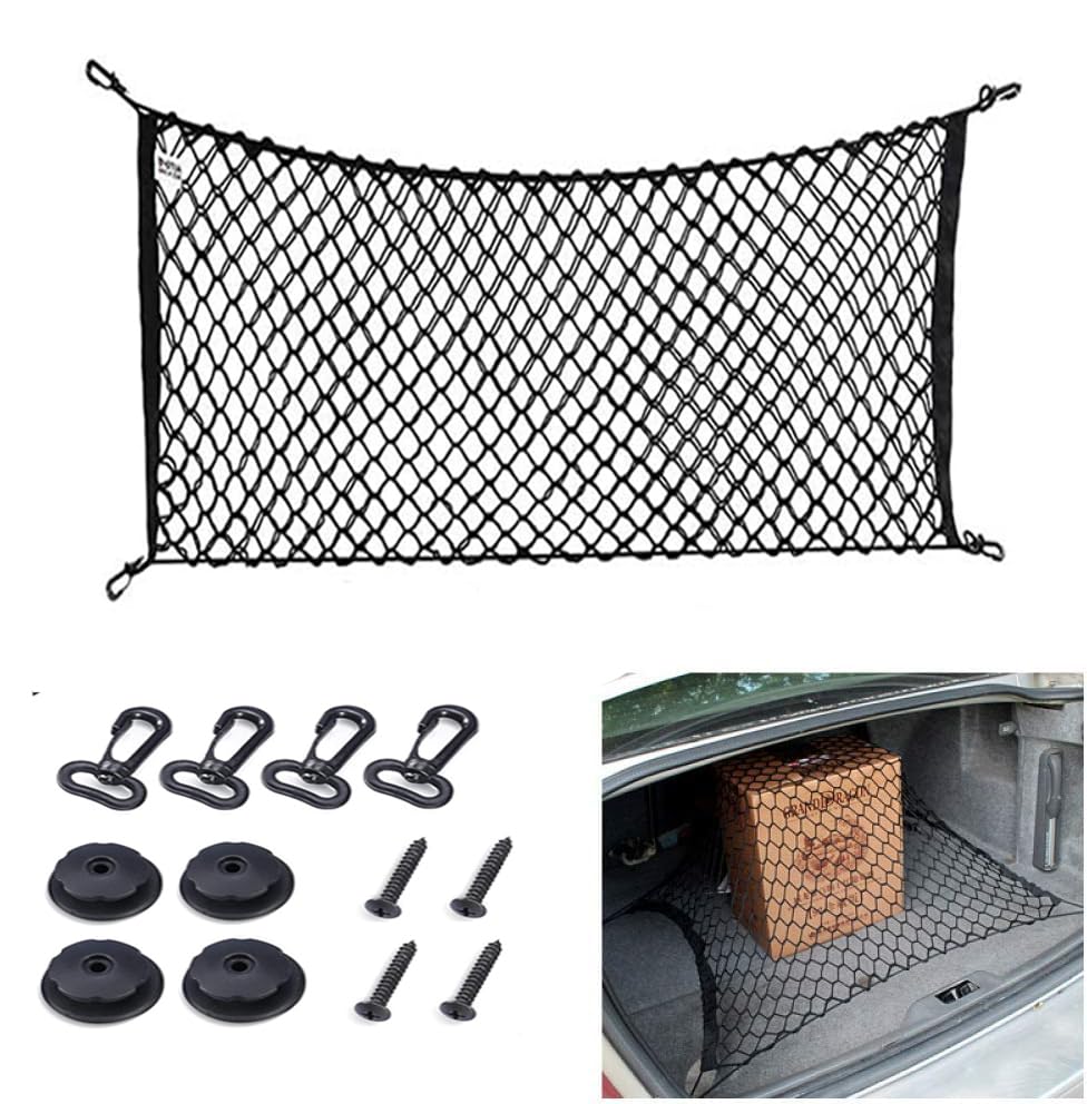 - High quality material to ensure durability and longevity. The large flexible storage net can hold larger and larger items inside. EASY INSTALLATION: 4 x Car Cargo Mesh Easy To Install In Your Car, For Rear Trunk Or Car Roof And Rear Seat.