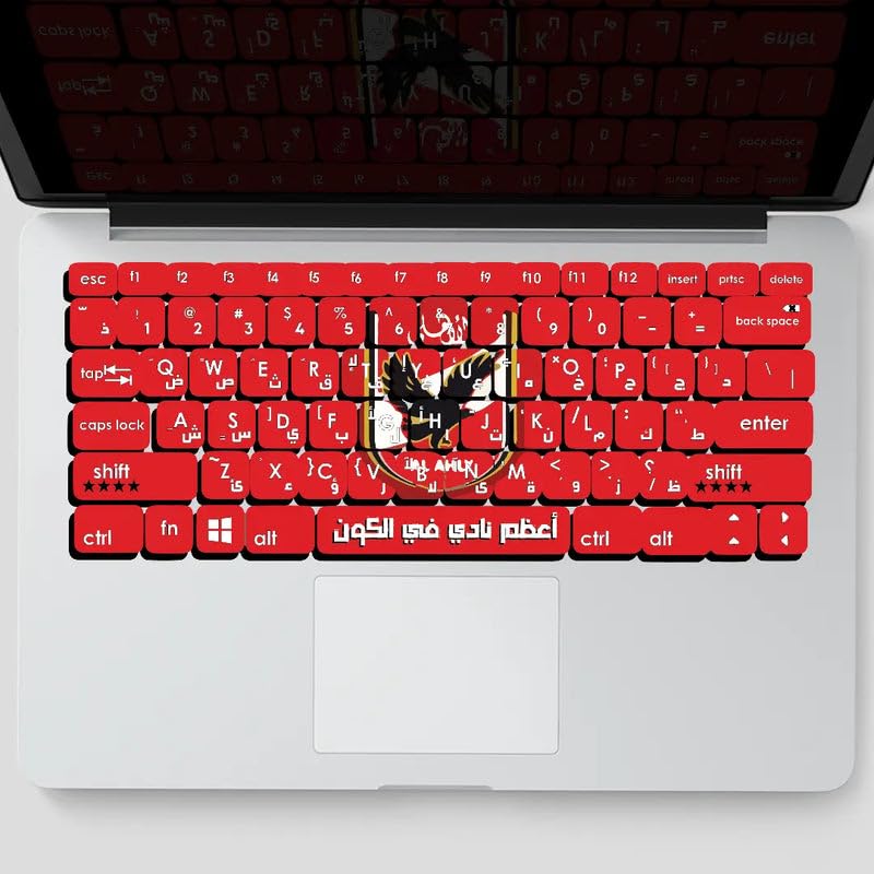 - DESIGN: Naruto-themed keyboard stickers featuring red and black colour scheme with Arabic and English characters for bilingual typing experience