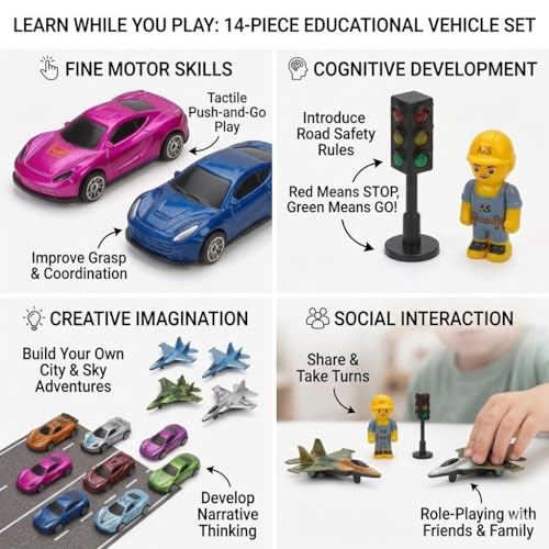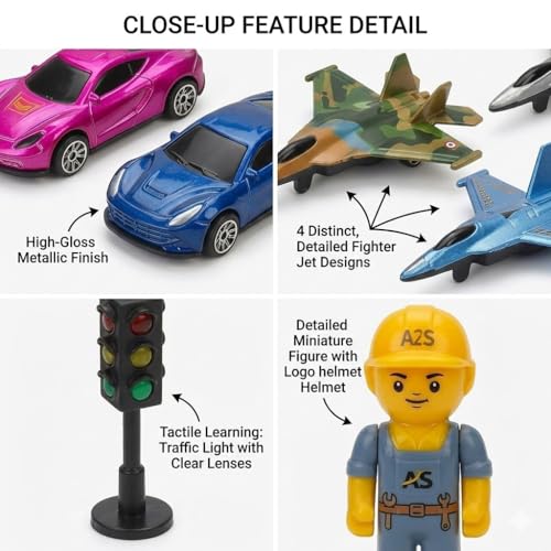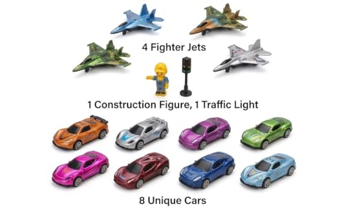 - مجموعة متنوعة متكاملة من 14 قطعة: تشكيلة هائلة في صندوق واحد! تتضمن 8 سيارات سباق أنيقة بتشطيبات معدنية نابضة بالحياة، و4 طائرات مقاتلة مفصلة، وإشارة مرور عمودية، ومجسم مهندس صغير لبناء عالم متكامل.