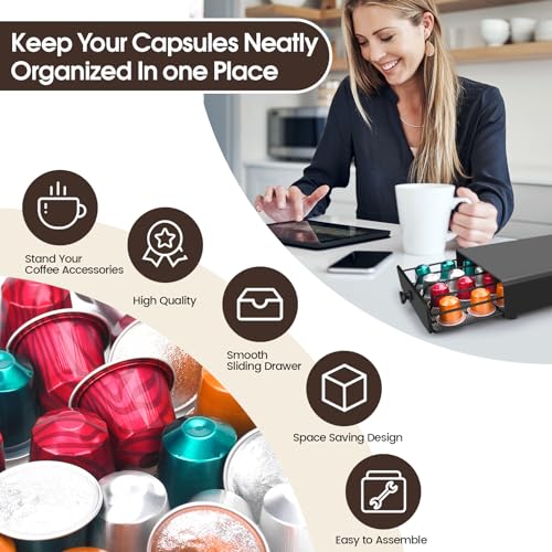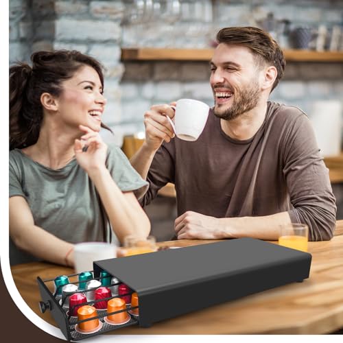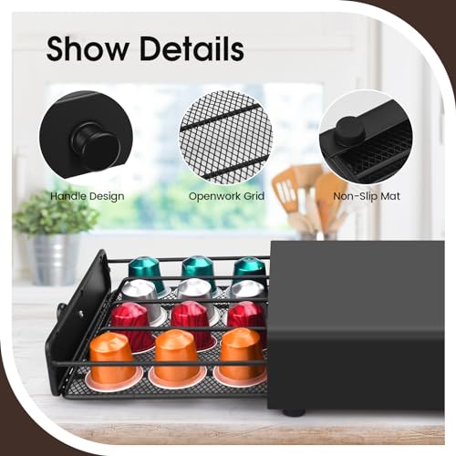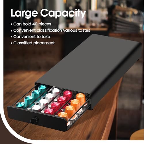 - Space-saving design: The capsule holder is stackable, saves a lot of space and can be placed directly under the coffee machine. Ideal for the kitchen, home or office. Matte black surface resists daily scratches and corrosion.The storage space design and pull-out drawer design show the taste of the owner.