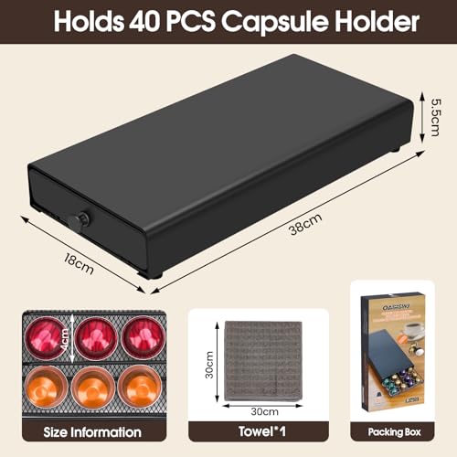 - Size: 38 x 18 x 5.5 cm (L x W x H). 4 rows offer space for up to 40 coffee capsules. You can quickly order your coffee capsules and access them more clearly. Thanks to the ultra-light movement of the drawers, you can brew your coffee faster. A brown cloth is included for cleaning the surface.