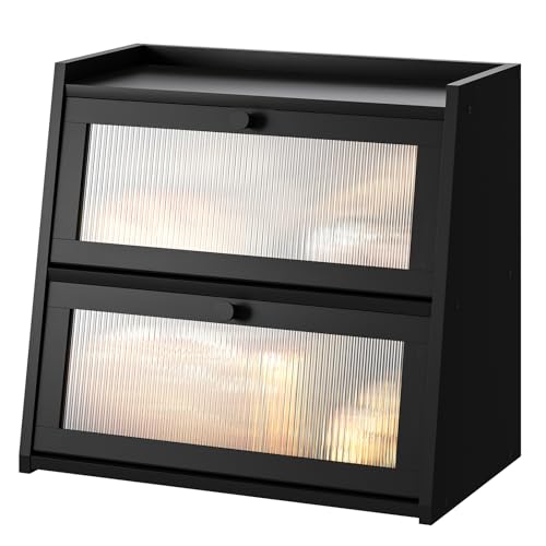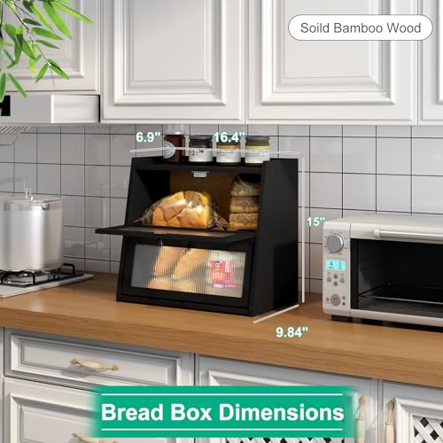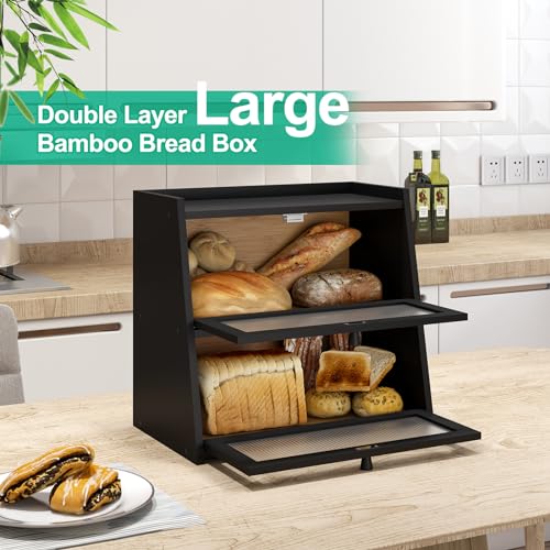 kiplant - صندوق خبز اسود كبير مزدوج الطبقات لطاولة المطبخ حاوية تخزين من الخيزران مع باب شفاف مموج ارسيليك